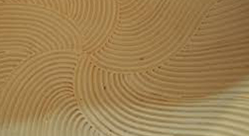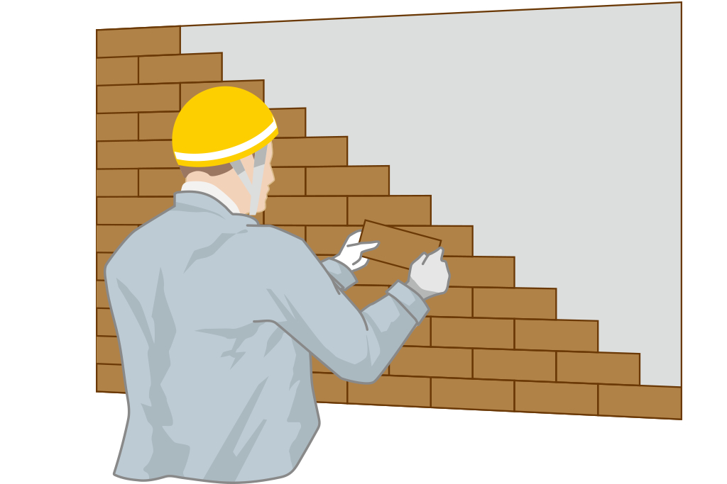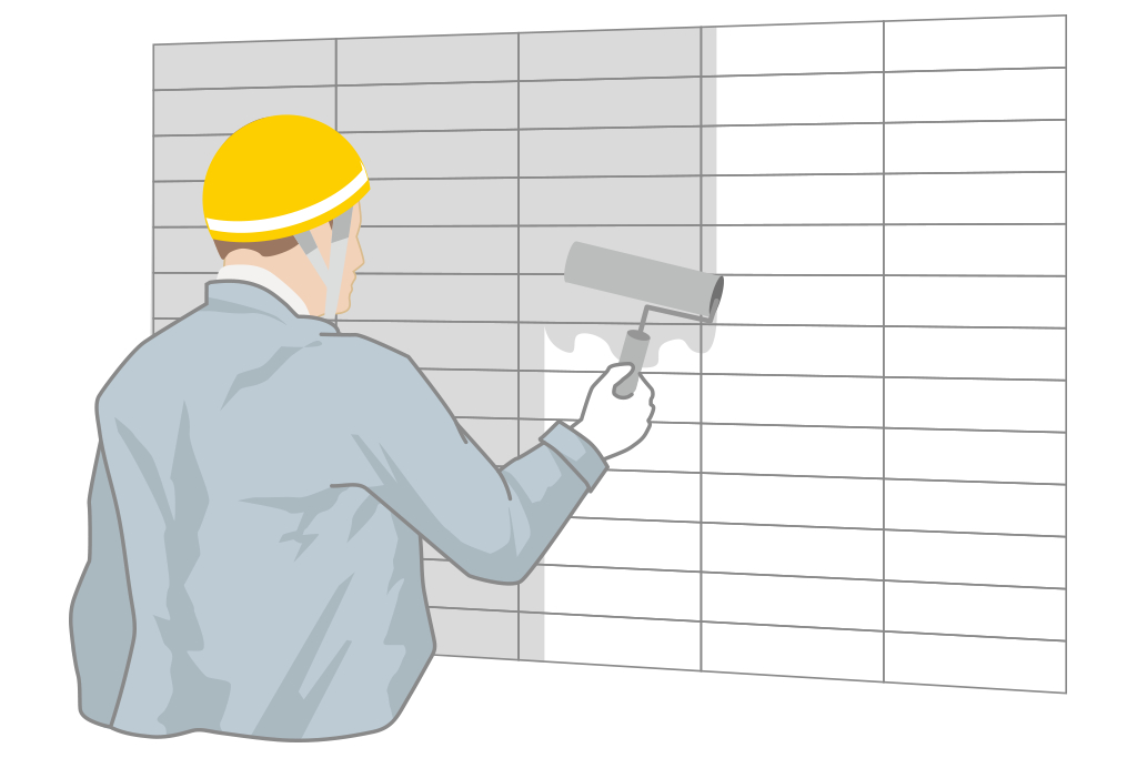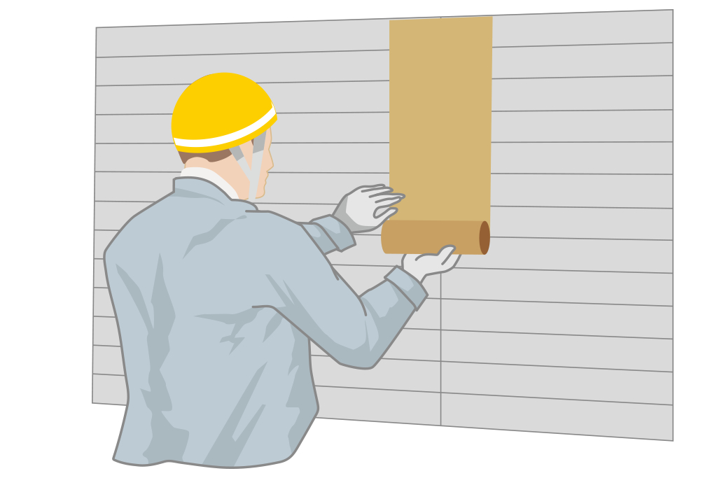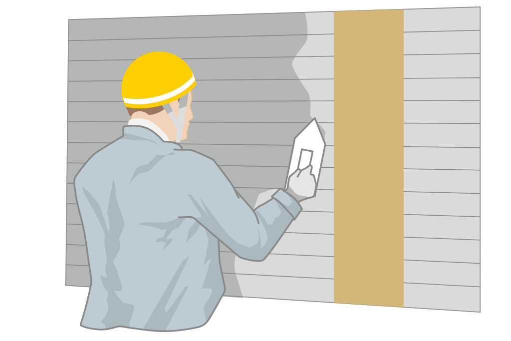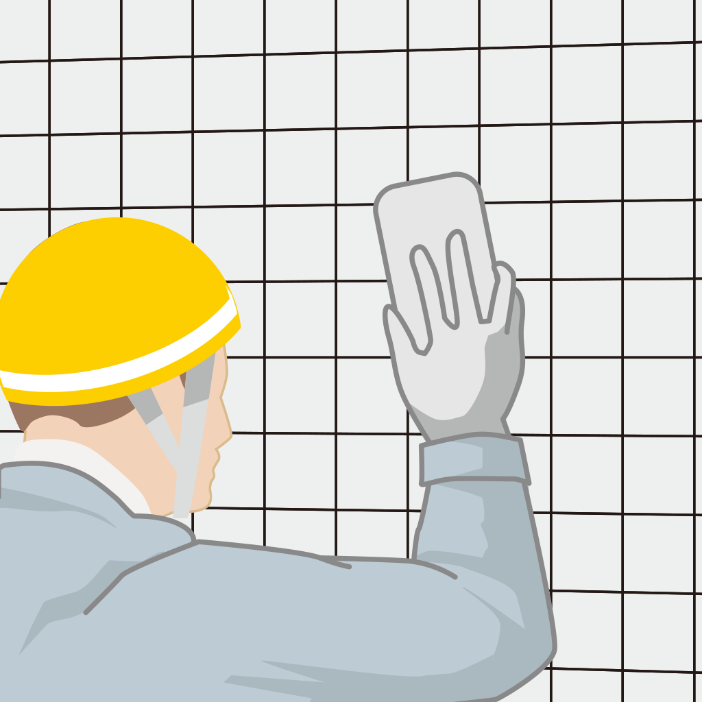クシ目ゴテデク目を立てて接着剤を均一に伸ばしてタイルに張り付け、その後目地詰めを行なう。