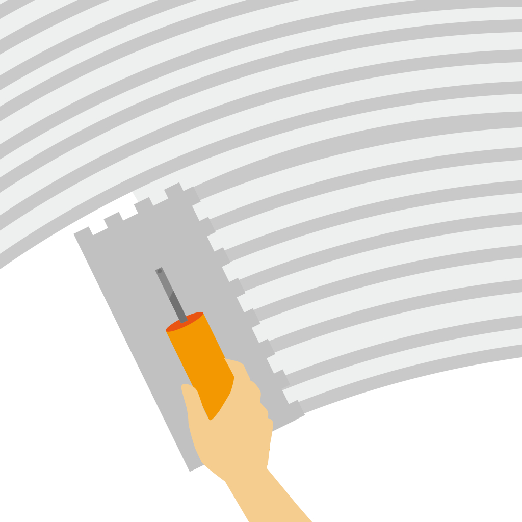 クシ目ゴテデク目を立てて接着剤を均一に伸ばした後、平滑に均一に伸ばした後、平滑に均してタイルを貼り付ける。